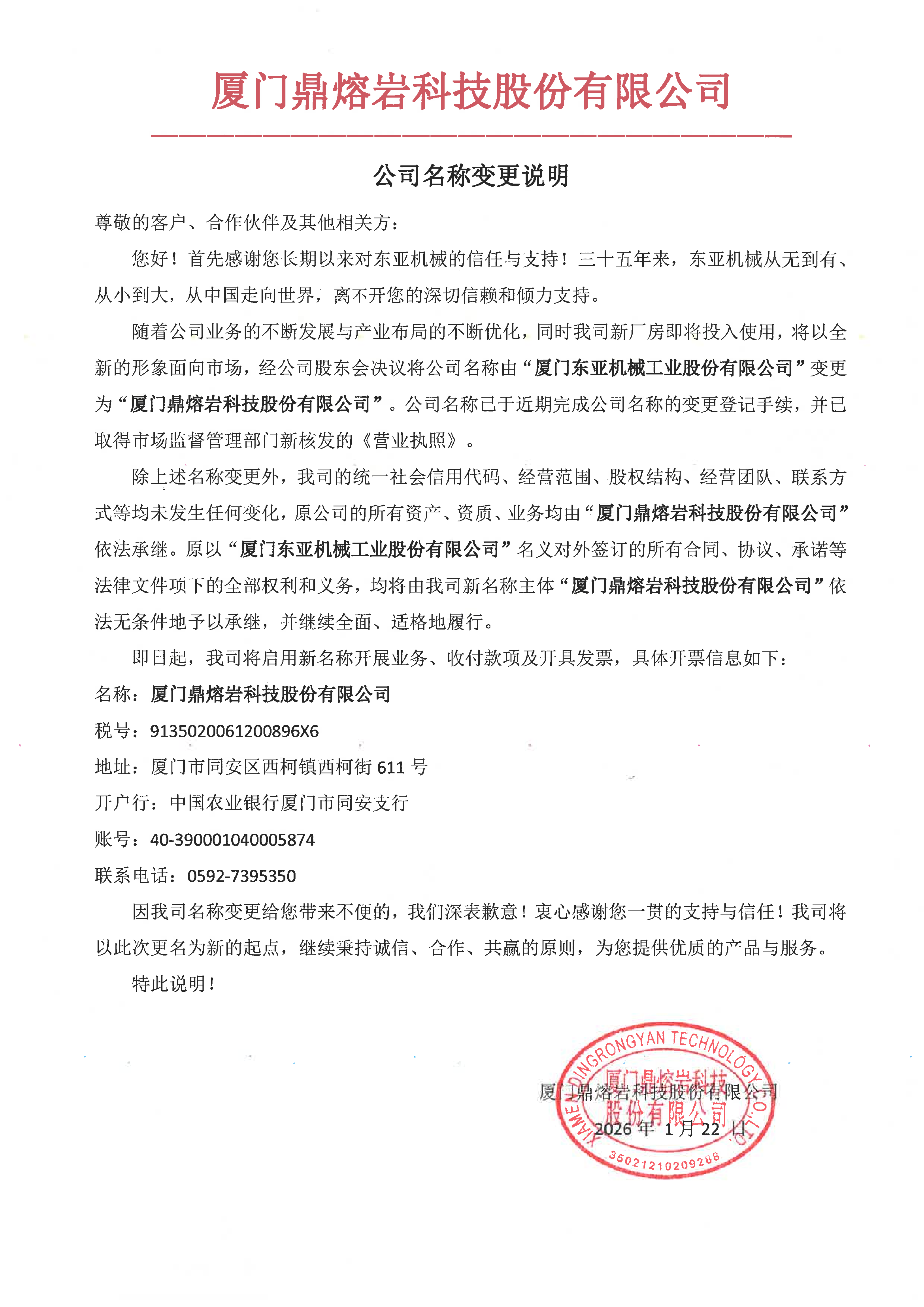 關(guān)于“東亞機械”更名為“鼎熔巖”的名稱變更說明